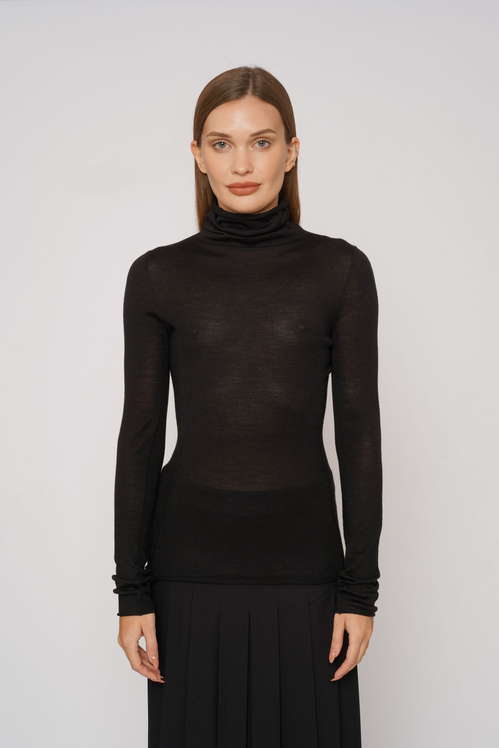 Водолазка идеально подойдет как для офисных аутфитов с брюками или юбками, так и для повседневных с джинсами