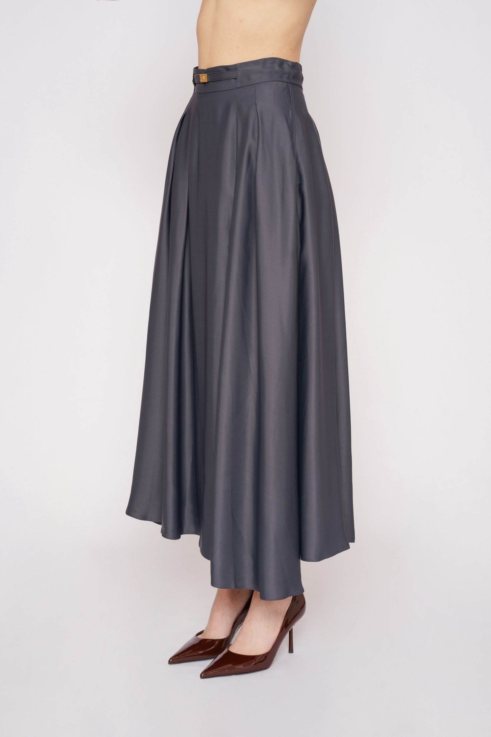 Юбка солнце-клёш стандартной посадки из вискозного атласа. Всё внимание — деталям: ремешок с пластинкой из золотистого металла с логотипом подчёркивает линию талии и регулирует посадку изделия.