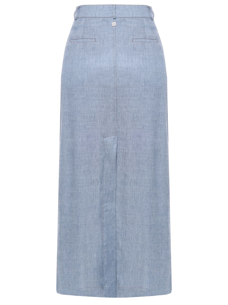 Голубая юбка-макси купажированного состава от PANICALE.Модель с акцентом кроя на бедрах и прямым подолом, высокой посадкой на талии, поясом со шлевками, прорезными карманами, застежкой на молнию и пуговицу, высокой шлицей сзади, которая обеспечивает комфортный шаг.Крой изделия обеспечивает идеальную посадку и отлично дополняет как деловой или офисный, так и более расслабленный повседневный образ.