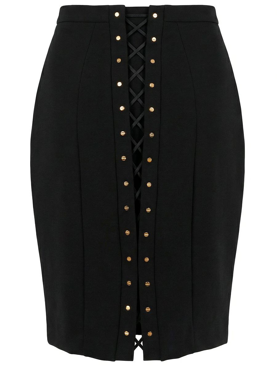Облегающая юбка из ткани бистретч. Спереди на притачном поясе расположена пластинка с логотипом. Сзади модель украшена перекрёстной шнуровкой с пуговицами из золотистого металла.